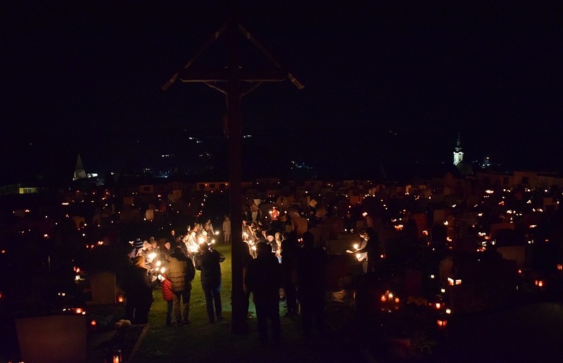 Zu Allerheiligen findet in katholischen Pfarrgemeinden eine Andacht auf dem Friedhof statt. Die Familien kommen zusammen und entzünden die Kerzen auf den Gräbern der Verstorbenen. Während der Andacht stehen sie wenn möglich direkt beim Grab. Es werden Fürbitten für die Toten gelesen, es wird gebetet und gesungen. Auf großen Friedhöfen wird die Andacht per Lautsprecher übertragen und mancherorts mit Chorgesang oder Blasmusik festlich gestaltet. In einem Rundgang am Friedhof segnet der Priester die Gräber und besprengt sie mit Weihwasser.
