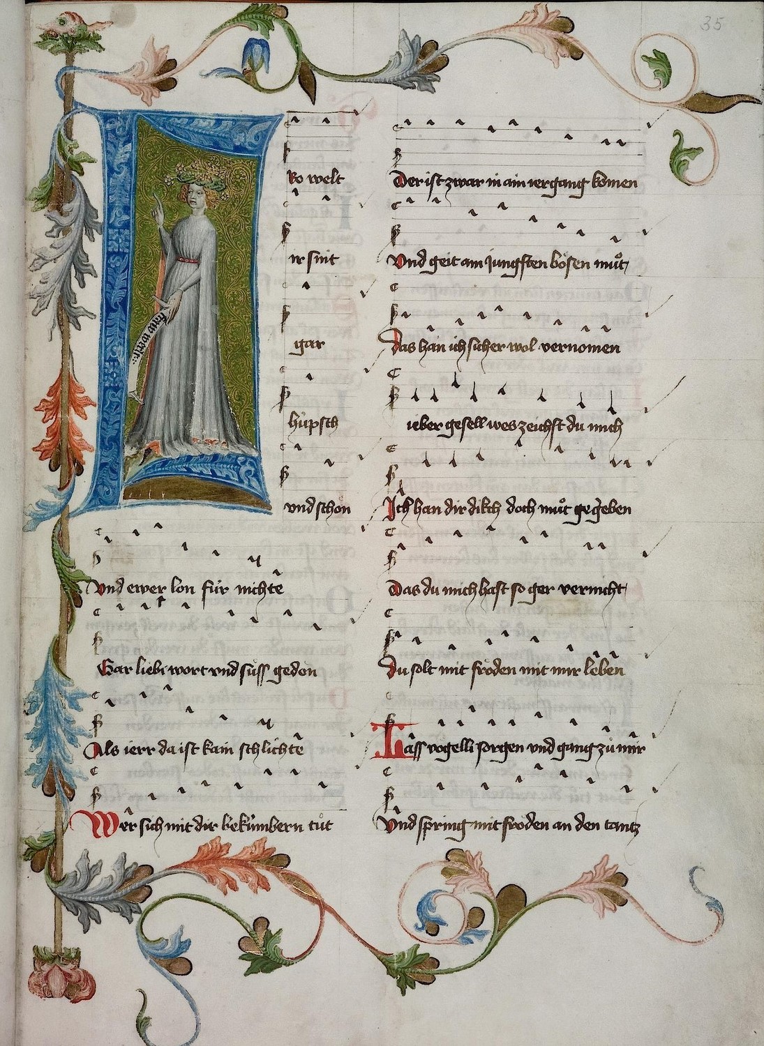 Vermutlich um 1414 – also auf dem Höhepunkt seiner Macht – ließ Graf Hugo von Montfort in Wien oder in der Steiermark jene Prachthandschrift seiner poetischen Werke anfertigen, die in der Heidelberger Universitätsbibliothek liegt: 40 Dichtungen in frühneuhochdeutscher, stark alemannisch gefärbter Sprache überliefert diese z.T. bebilderte und mit 10 Notenaufzeichnungen versehene Handschrift, aber nur die ersten 38 Texte dürften tatsächlich von Hugo stammen, denn Nr. 39 und 40 wurden erst nach seinem Tod eingetragen und weisen auf eine fremde Autorschaft hin. In den ersten 38, sicher ‘echten’ Hugo-Texten begegnet uns (in Form poetischer Reden, Briefe und Lieder) ein tief gläubiger, geradliniger Mensch, der sich von hohen moralischen Idealen beseelt zeigt und neben aller Lebensfreude auch bedrückende Erfahrungen mit Leid und Tod reflektiert.