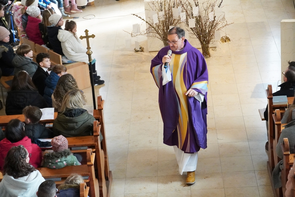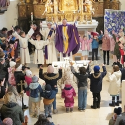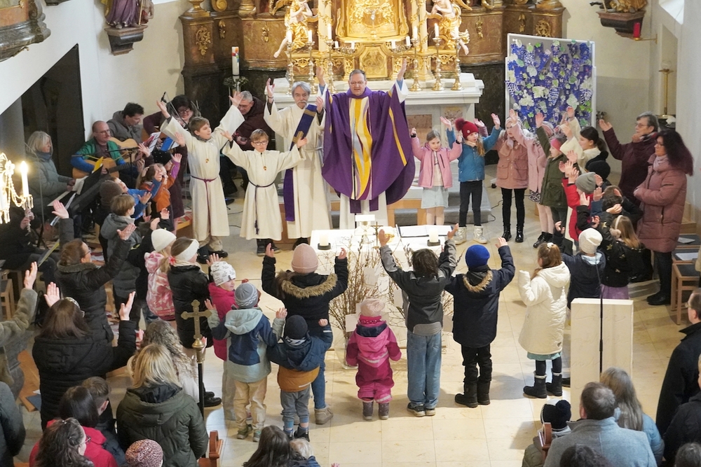 Die Kinder durften rund um den Altar sitzen um aktiv mitzufeiern und zu singen. Auf den großen Fastenstrauch vor dem Altar hängten die Kinder Karten auf, auf denen sie schrieben, was sie sich für gute Taten für die Fastenzeit vornehmen.